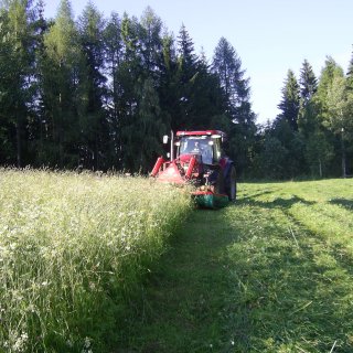 Louky sečeme za pomocí traktorů CASE 135 MXU, CASE 140 MXU a čelní rotační lišty s kondicionérem, značky TAARUP, pracovní záběr 3,25 m. Je možno využít i boční žací lišty s kondicionérem, značky TAURUP, pracovní záběr 3,5 m.